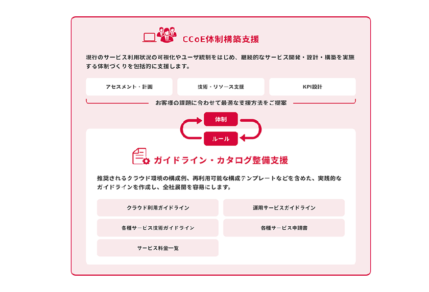 (※)CCoEは、クラウド利用に関するガバナンスや導入手順を策定・推進する社内組織です。クラウド導入にあたってのルール整備、セキュリティ対策、コスト管理を統括して、全社的なクラウド活用を進める役割を担っています。