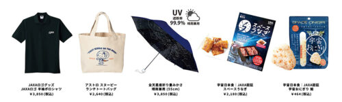 ラインナップは多岐にわたる。JAXA LABELの公式ロゴアイテムや「アストロスヌーピー」シリーズなど日常で楽しめるアパレルのほか、食品メーカーが提案しJAXAの認証を受けた「宇宙日本食」も販売される。宇宙日本食には、おにぎりや名古屋コーチン、カレーなどの主食から、ショートケーキやアイスなどのデザートまで豊富に用意されている。