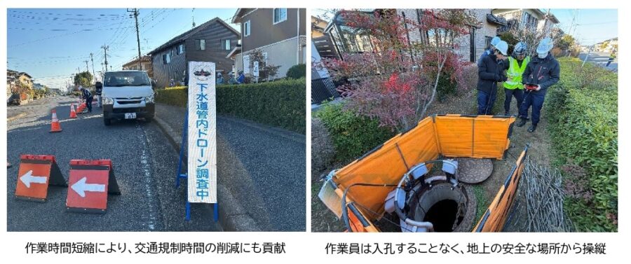 本調査では、国が定める「下水道管路の全国特別重点調査」に基づき、施工から30年以上が経過した管路約3kmを点検しました 。その結果、従来の人力調査では約5日間を要する工程を2日間で完了し、3日間の工期短縮を実現しました 。作業員が管内に入ることなく地上の安全な場所から操縦することで、酸欠や有毒ガスのリスクを排除し、交通規制時間の削減にも大きく貢献しています 。