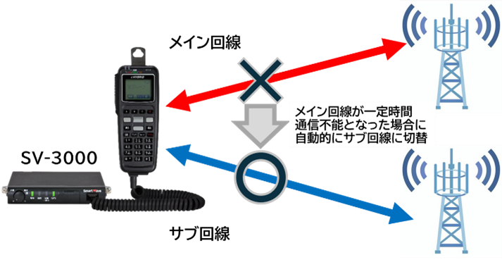 新機能としてIP無線運用時の信頼性を高めるために 2枚のSIMを利用可能としたデュアルSIM機能を搭載しました。docomo回線をメイン、au回線をサブとして、メイン回線が一定の条件で通信困難となった場合には自動的にサブ回線に切り替わる機能を搭載。利用者は回線の切替を意識する必要がないため、通信障害等の発生時の安心感が高まります。