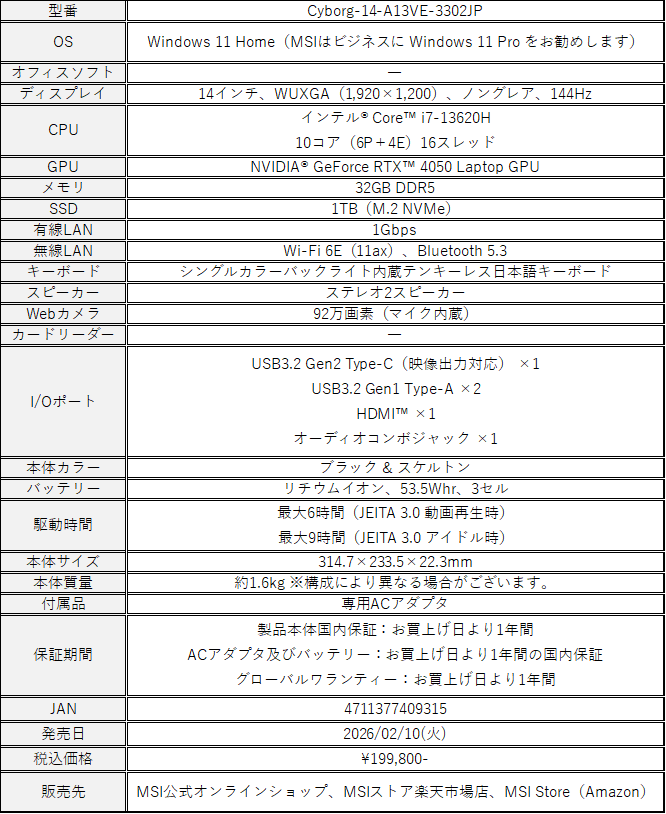 エムエスアイコンピュータージャパン株式会社は、「Core i7」「RTX 4050」「14インチ 144Hz ディスプレイ」 の組み合わせにより、ゲーミングからクリエイティブ作業・マルチメディア用途までパワフルかつ快適にこなせる14インチ・ハイスペックゲーミングノートPC「Cyborg-14-A13VE-3302JP」 を2026年2月10日(火)より順次販売開始 いたします。