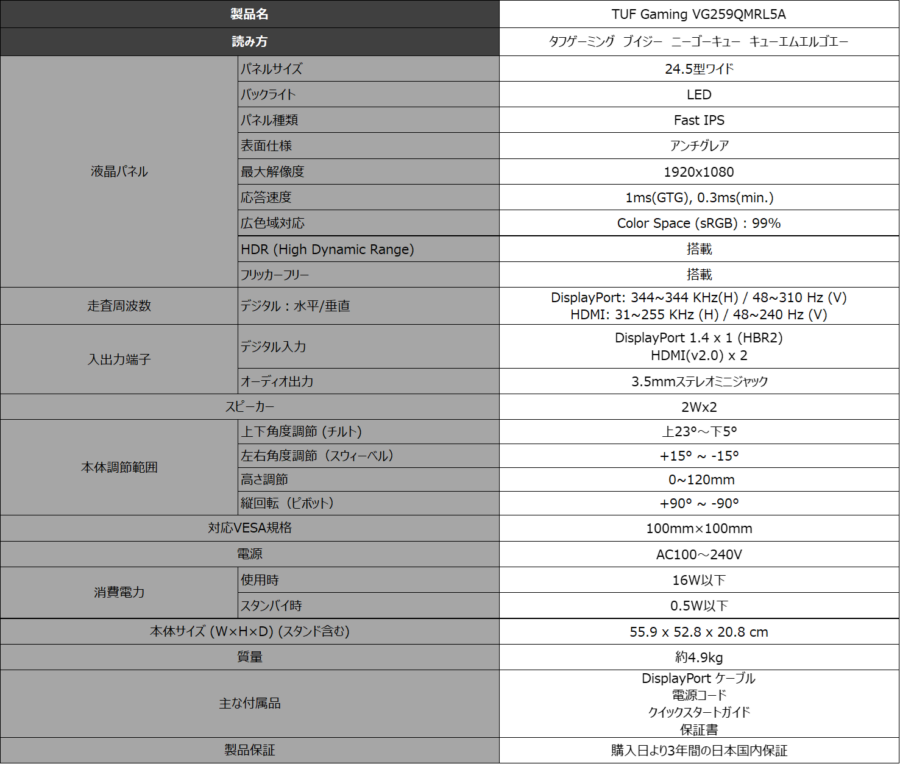 製品詳細:https://www.asus.com/jp/displays-desktops/monitors/tuf-gaming/tuf-gaming-vg259qmrl5a/