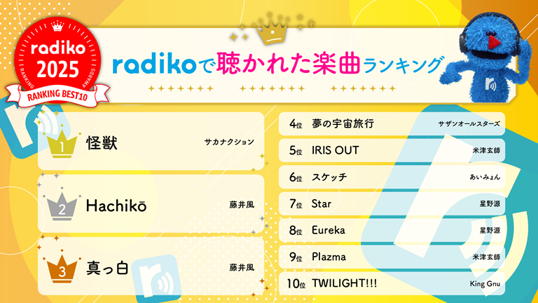 また、radikoで聴かれた楽曲ランキングでは、2025年2月20日リリースのサカナクションの「怪獣」(アニメ『チ。―地球の運動について―』主題歌)が1位。藤井風、米津玄師、星野源の楽曲がベスト10に複数曲ランクインするという結果となった。