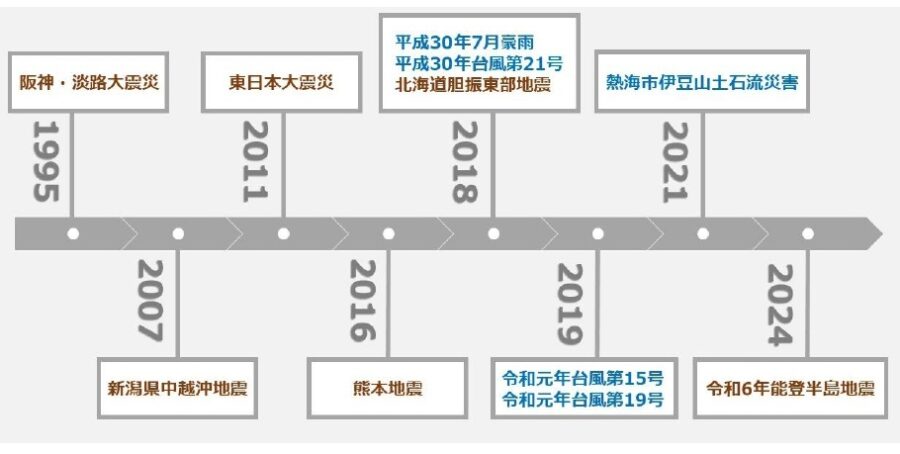 アクティオは、これまで多くの災害復旧を支えてきました。阪神・淡路大震災、新潟県中越沖地震、東日本大震災、熊本地震、平成30年7月豪雨、北海道胆振東部地震、令和元年台風第15号・19号、熱海市伊豆山土石流災害、令和6年能登半島地震など。こうした経験をもとに、より迅速な対応体制を構築しています。