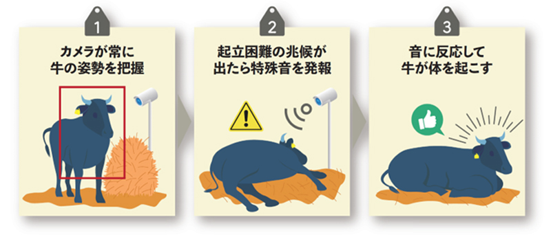 起立困難につながる牛の危険な姿勢を検知すると、AIカメラから音を発報し、牛がその音に反応して姿勢を変えることで、起立困難の発生を予防する。起立困難により牛を失った場合の経済的損失を防ぐだけでなく、牛舎見回りにかかる肉体的・精神的な負荷の軽減に加え、非接触型で牛にストレスを与えないアニマルウェルフェアを実現するものだ。