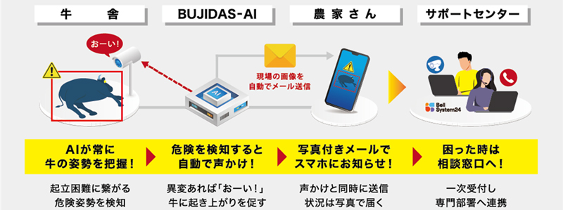 BUJIDASは、肉用牛経営を行う肥育牛生産者に向け、出荷直前での牛の死亡事故の大きな原因とされる起立困難が発生しないよう、人に代わってネットワークカメラで牛舎の監視を行う日本初の非接触型サービス(特許出願済)。