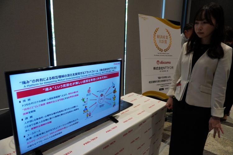 革新的なものづくりを評価する経済産業大臣賞には、NTTドコモ(展示ブース:General Exhibits 1H007)の「〝痛み〟の共有による相互理解の深化を実現するプラットフォーム」が選ばれた。同技術は、言語化が難しい要素の一つである〝痛み〟を他人と共有することを可能にした世界初の基盤技術。人が感じる身体的・心理的な痛みを他者に伝えるのは難しく、これまでは個人の主観に基づく推測に頼らざるを得ない場面も多く、客観的な理解が困難とされてきたが、同技術により、相手の痛みを自分ごととして体感・理解でき、医療におけるコミュニケーションの質の向上やカスタマーハラスメント・SNSなどの誹謗中傷の対策などに貢献する。