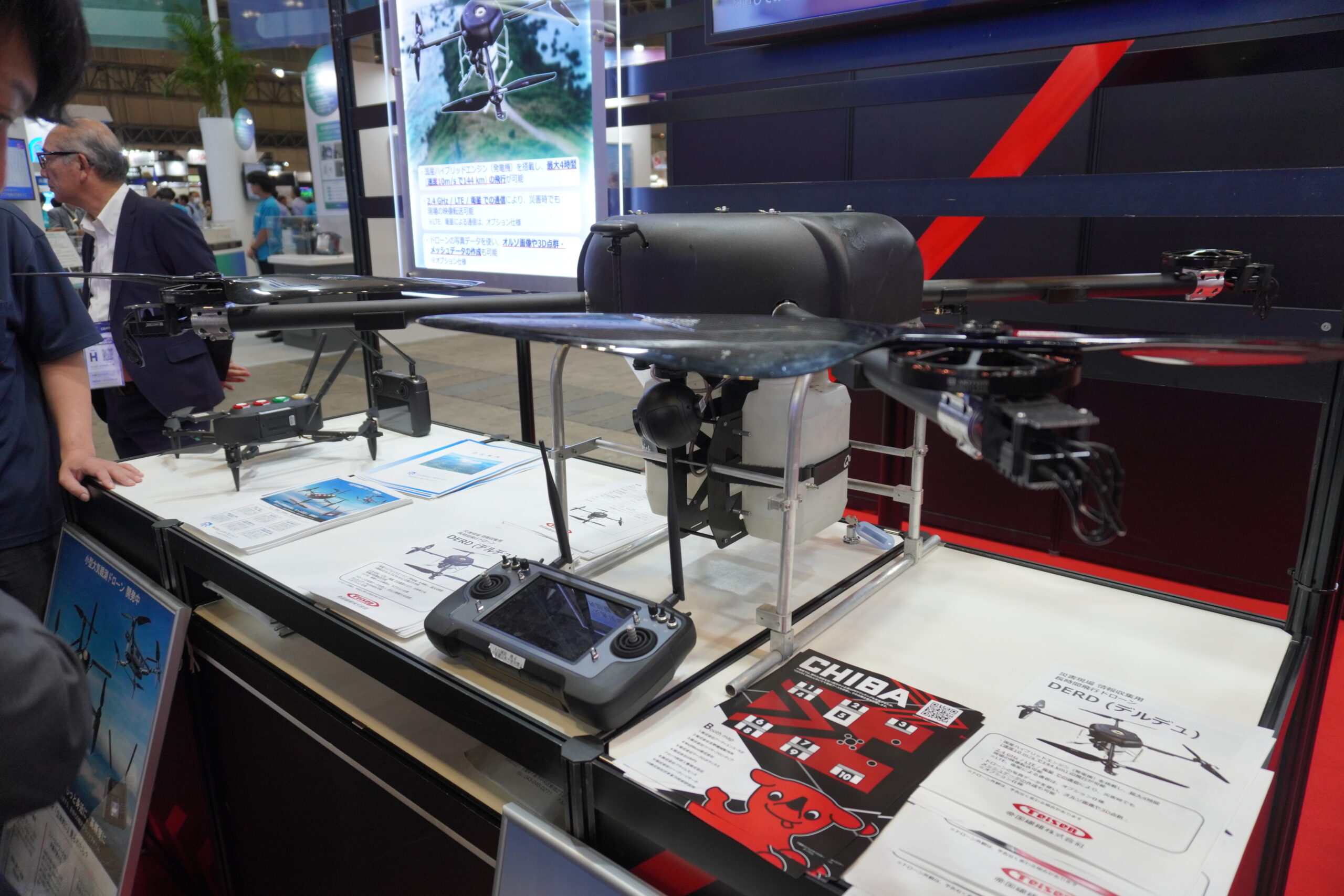 千葉県ブースに出展したツバサ・フロンティア(千葉市中央区、田上敏也代表取締役)は、4時間飛行可能なハイブリッドエンジン搭載ドローンと、小型の大気化学物質計測ドローンを紹介した。長時間飛行と低コストな環境測定により、地方自治体の防災業務や研究機関の大気観測における課題解決を目指す。
