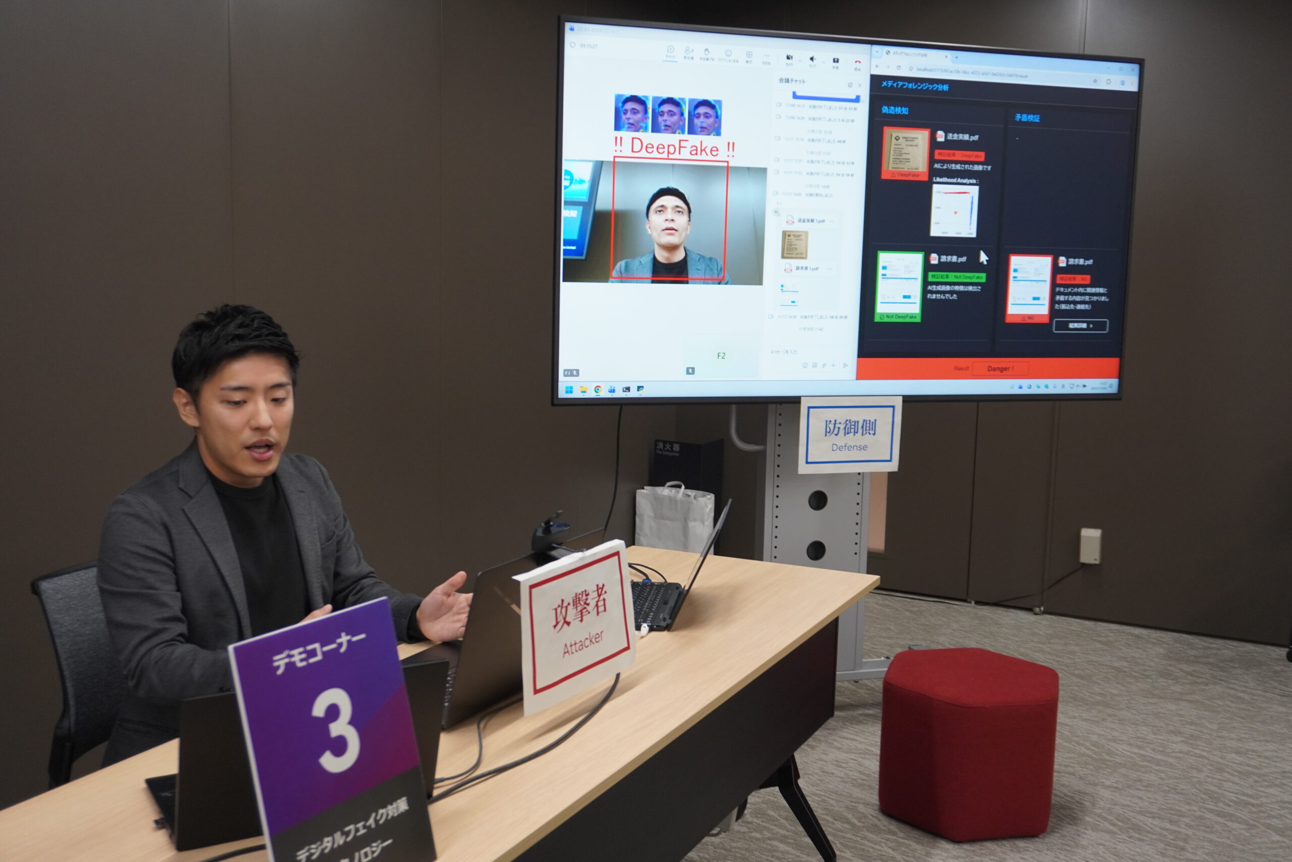 写真は 『デジタルフェイク対策テクノロジー』のデモ ディスプレイの写真はフェイク
