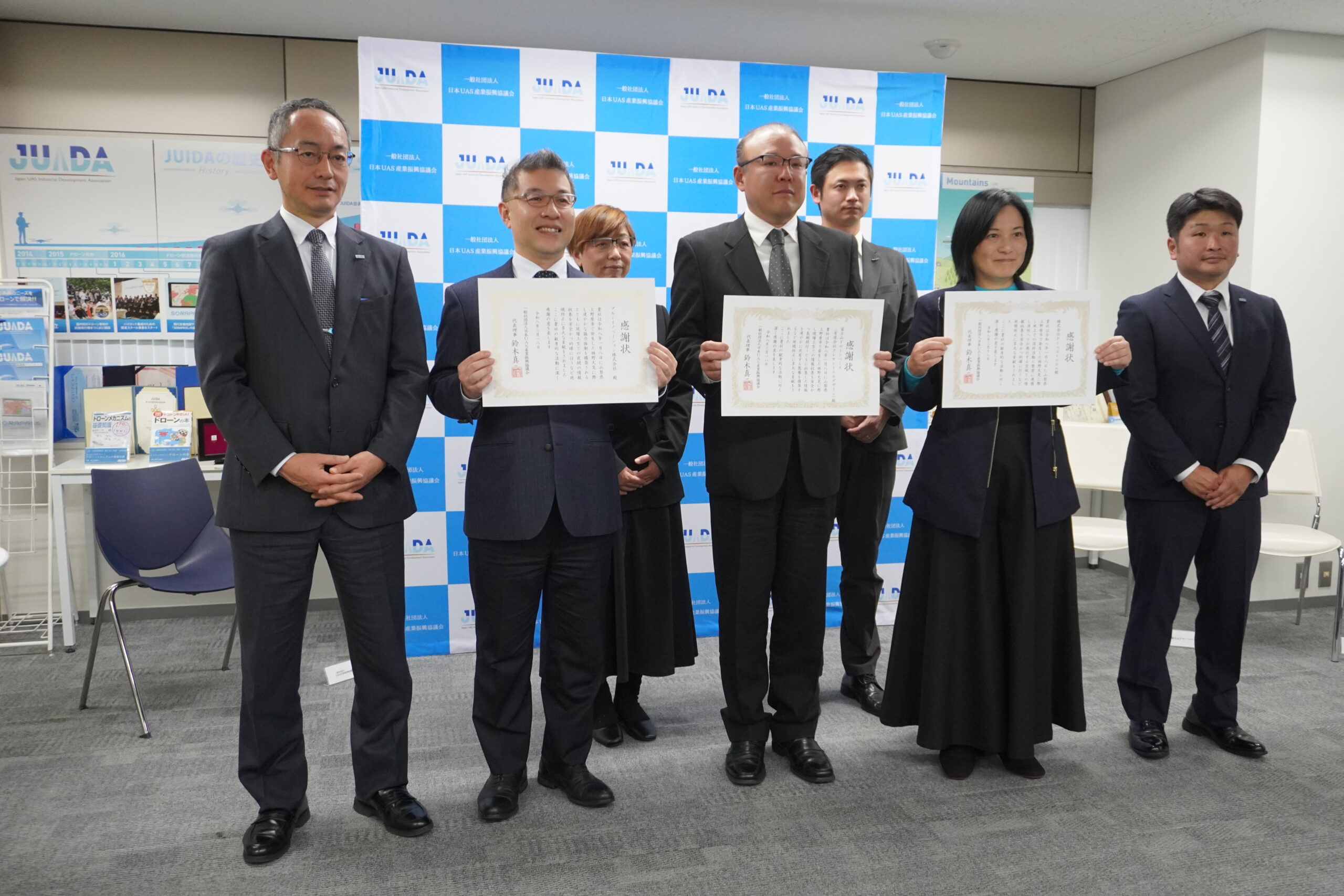 贈呈式では、JUIDAの嶋本学Dキューブ本部長から熊田ブルーイノベーション社長、渡邉富士山ドローンベース代表取締役、森内倫子Prodrone広報戦略部長にそれぞれ感謝状が授与された。