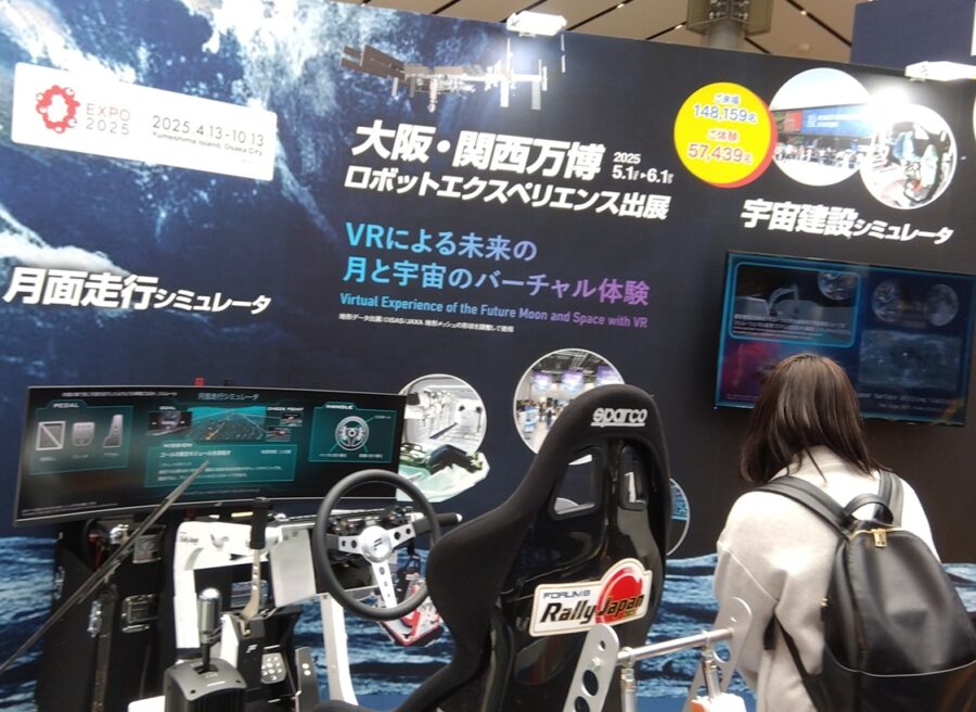 最先端の3DCG・VR技術で高精度なデジタルツイン環境を構築し、宇宙建設・月面走行のVRシミュレーションを展示。宇宙建設は、モーションシートで、1/6重力の超リアルな月面でのバックホウの遠隔操作、月面走行シュミレーションは、重量環境での独特の挙動を体験できる。